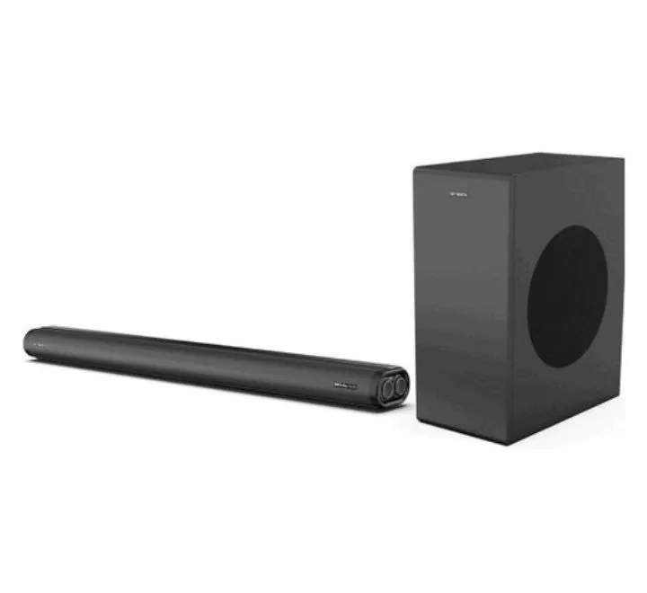 The soundbar features a sleek, minimalist design with a durable plastic casing that complements modern interiors. An integrated LED display provides clear visual feedback on volume levels, input sources, and connection status, making operation intuitive and straightforward.